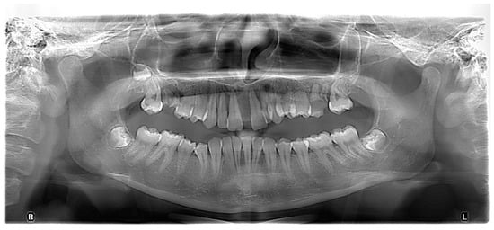 The periodontal diagnostic was stage III, grade C periodontitis. Stage III of periodontitis, in this case, was defined based on the severity (interdental CAL ≥ 5mm, radiographic bone loses extending to the apical third of the root) and complexity of management (probing depth > 6 mm, vertical and horizontal bone loss, tooth mobility degree ≥ 2, and masticatory dysfunction). The grade of periodontitis was estimated with direct or indirect evidence of % bone loss/age > 1.0 and destruction exceeding biofilm deposits (suggestive of rapid progression and early onset disease) [12,13,14]. The orthodontic diagnostic was class II, division 1 malocclusion (Angle classification) and deep bite malocclusion, with dental malposition primary and secondary to the periodontal disease. The smile line was altered due to the overgrowth of gingival tissue at the maxillary tooth. Additionally, following vitality and percussion tests, both the maxillary and mandibular incisors were vital and without any signs of pulpal involvement.