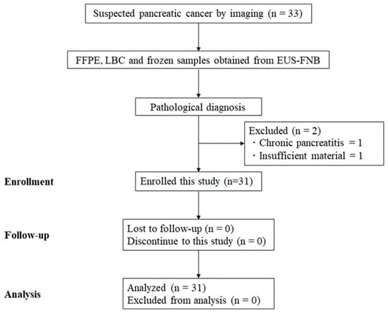 This was a prospective, single-arm pilot study of the feasibility and efficacy of targeted NGS using EUS-FNB samples collected at one Japanese referral center. All consecutive patients aged ≥ 18 years initially diagnosed with PC on computed tomography (CT) or magnetic resonance imaging who required EUS-FNB were included in this study between November 2019 and March 2020 at Kagoshima University Hospital. FFPE, LBC, and frozen tissue samples were obtained with EUS-FNB. The exclusion criteria were as follows: (1) severe, poor medical condition for EUS-FNB; (2) no history of treatment, including chemotherapy or surgical resection; (3) benign case with EUS-FNB; (4) pregnancy; and (5) refusal to participate in this study (Figure 1).