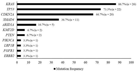 The detected gene mutation profiles are shown in Figure 3. Repeated detection of gene mutations included KRAS (86.7%), TP53 (73.3%), CDKN2A (66.7%), SMAD4 (36.7%), ARID1A (16.7%), KMT2D (6.7%), and PTEN (6.7%). The following genes accounted for less than 5% of the identified alterations: PIK3CA, LRP1B, FGFR1, and ERBB2 (Figure 3). The results from NGS analysis of FFPE, LBC, and frozen samples are summarized in Table 3. LBC samples were most included at VAF > 10% and 30% except for VAF > 20%. The success rate of NGS with more than 10% VAF was 86.7% (n = 26) using FFPE, LBC, or frozen samples.