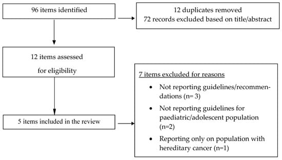 Systematic search revealed 96 items with potential for inclusion in our narrative review, of which 12 were duplicated and another 74 were excluded based on title/abstract. There were finally twelve items reviewed as potentially eligible for our review, of which three were excluded because of not reporting guidelines/recommendations, two items were excluded because of not reporting guidelines for paediatric/adolescent population, one item was excluded for reporting only on population with hereditary cancer and one item was excluded because of reporting on population with cancer in pregnancy.