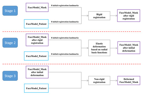 where = (xi,yi,zi) is the ith vertex of FaceModel_Mask; is the ith vertex of FaceModel_Mask after the initial elastic deformation; is the number of vertices of FaceModel_Mask; is the deformation parameter; is the affine transformation parameter; is the radial basis function, where is a positive parameter. The preliminary elastic deformation of FaceModel_Mask was realized based on the correspondence between the landmark sets of FaceModel_Patient and FaceModel_Mask and this function formula.