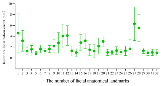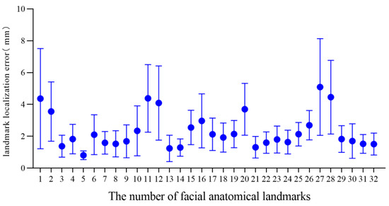 Landmark localization error for each facial anatomical landmark in the MM group.