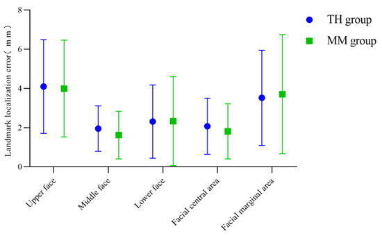 The mean and standard deviation of the landmark localization error of the anatomical landmarks in each facial region of the Point_TH and Point_MM group were calculated, as shown in Table 3 and Figure 7. According to the measurement results, both algorithms are more effective in determining facial anatomical landmarks in the middle face than in the upper and lower face, and the determination of landmarks in the central area of the face was better than that in the marginal area. The determination of landmarks in the central area of the face was slightly better in the Point_MM group than in the Point_TH group, and that in the marginal area was slightly better in the Point_TH group.