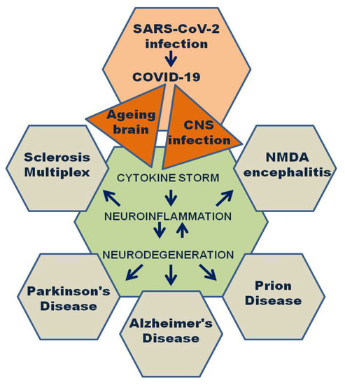 Viral, bacterial, or other infections of the nervous system showed the ability to trigger or accelerate neuroinflammation and neurodegeneration, subsequently leading to various clinically relevant manifestations [82,83,84]. Most of those disorders are age-dependent, suggesting that the ageing brain is more vulnerable to inflammatory degeneration provoked by a cytokine storm [85,86,87]. Additionally, severe COVID-19 has been observed in older people, who are already at higher risk of developing neurological disorders, even without SARS-CoV-2 infection [88]. The possibility of the preclinical phase of underlying molecular and physiological neurodegenerative processes triggered by a viral infection should not be excluded [89].