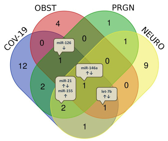 Numbers of overlapping of representative miRNAs in several different physiologically altered conditions, associated with COVID-19. The alternatively expressed miRNAs are presented in text bubbles. COV-19—covid-19; OBST—obesity; PRGN—pregnancy; NEURO—neurological diseases.