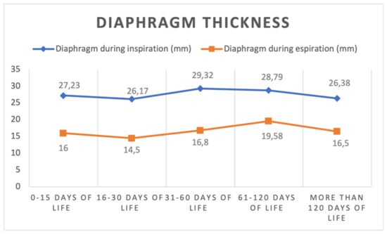 We studied the contraction of the diaphragm mainly in the posterior zone as the apposition zone was in development, as well as the accessory respiratory muscles. At this age, the diaphragm was flat, not a dome, as in the adult, and the ribs were horizontal. So far, a few studies have evaluated average values of diaphragm excursion or thickness in healthy children, unifying children from extensive age ranges (e.g., 1 month to 2 years or 6 to 12 years) [9]. This limited our ability to compare our data with previous data. However, the few studies including children aged 1 month to 2 years had a similar thickness as found in our cohorts, of about 3 mm [8,9,10].