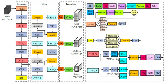 The structure of the YOLOv5s-SA target detection network is shown in Figure 1, which consists of the backbone feature extraction network, neck network and head target prediction network. (1) The backbone network is mainly composed of the focus, CSP module and spatial pyramid pooling (SPP) [33] module. In order to reduce the number of parameters in the model, partial convolution in the backbone network is replaced by DWConv [31]. (2) The feature pyramid network (FPN) [34] and path aggregation network (PAN) [35] are used in the neck to realize multi-scale feature fusion. In order to further enhance deep and shallow semantic feature fusion and suppress redundant background noise, we introduced an SA attention mechanism [30] to enhance the model’s attention to small target sperm. (3) The head prediction network integrates features of the acquired enhanced feature maps and introduces EIoU instead of CIoU [36] to calculate the bounding box regression losses and obtain the prediction results.