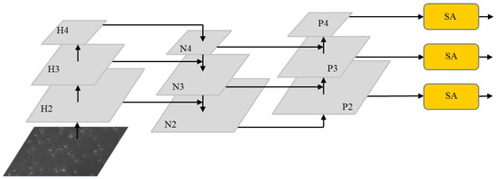 Feature fusion algorithms based on channel attention and spatial attention are applied to the neck network. The optimized multi-scale feature fusion network is shown in Figure 3. After extracting image features from the original image through the backbone network, three feature maps with different depths are obtained: H2, H3 and H4. The feature map is then input to the neck network. First, the FPN structure conveys strong semantic features from the top-down, incorporating deep feature information into the shallow layer. After concat and the up-sampling of the deep feature map H4 and middle layer feature H3, N3 is generated by the convolution operation. Feature map N3 is then fused with shallow feature map H2 by up-sampling to generate the enhanced feature map N2. Because FPN is limited by unidirectional feature fusion, shallow feature information is not fully utilized. The PAN structure further carries out feature fusion on the feature layer and integrates the shallow feature information into the deep layer. N2 is down-sampled and fused with feature layer N3 to obtain the enhanced feature figure P3. P3 is down-sampled and fused with feature layer N4 to obtain the enhanced feature figure P4. Finally, feature maps P2, P3 and P4, combined with the efficient SA modules, enable the neck network to accurately learn the correlation of feature maps between channels, alleviate background information and noise interference from non-sperm cells and enhance the feature extraction effect of target sperm.