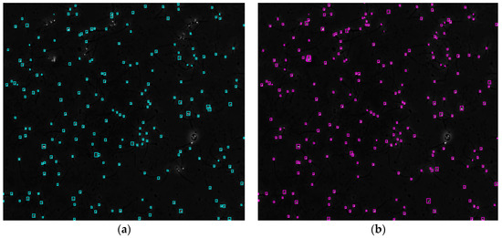Figure 4 shows the comparison of the sperm detection results before and after the network model optimization. It can be seen from Figure 4a that the original YOLOv5s model is prone to missed detection and false detection. Figure 4b shows that the optimized YOLOv5s-SA model significantly improves the defects of the original YOLOv5s sperm detection, and the introduction of the SA attention mechanism can make the model more fine-grained to express multi-scale features, pay more attention to small targets and improve the accuracy of the network sperm detection.