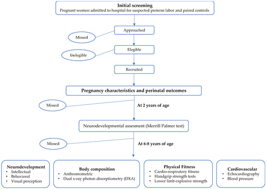 Prospective cohort study including children whose mothers suffered a suspected preterm labor during pregnancy and paired controls. Pregnant women were recruited during pregnancy and children have been followed up into childhood. At 2 years of age, a neurodevelopmental study was performed on all these children [9]. In the current study, we carry out a neurodevelopment, cardiovascular, and metabolic assessment at 6–8 years of age (Figure 1).