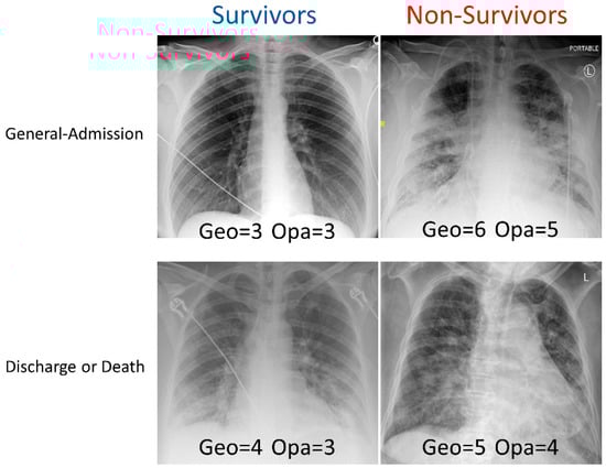 - Borghesi, A.; Zigliani, A.; Golemi, S.; Carapella, N.; Maculotti, P.; Farina, D.; Maroldi, R. Chest X-ray severity index as a predictor of in-hospital mortality in coronavirus disease 2019: A study of 302 patients from Italy. Int. J. Infect. Dis. 2020, 96, 291–293. [Google Scholar] [CrossRef] [PubMed]