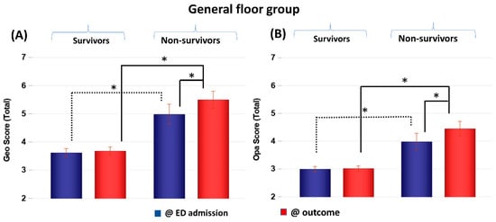 CXR scores of the GF group obtained at ED admission and at outcome were stratified by non-survivors and survivors (Figure 2). Geographic and opacity scores behaved similarly, and they are discussed together, with geographic scores generally yielding bigger differences. Geographic and opacity scores were significantly higher (worse disease severity) in non-survivors compared to survivors at both time points (p < 0.05). Non-survivor scores significantly worsened at the second time point compared to the first time point (p < 0.05), but survivor scores did not (p > 0.05).