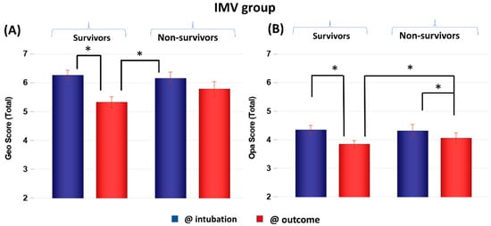 (A) Geographic extent (Geo) and (B) opacity (Opa) CXR scores of IMV patients taken at intubation and outcome stratified by survivors (N = 118) and non-survivors (N = 59). * p < 0.05. Error bars: SEM.