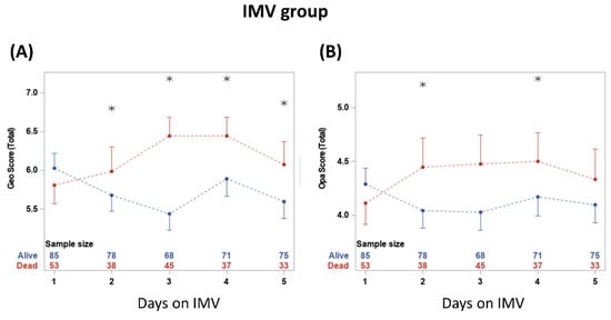 (A) geographic extent and (B) opacity chest X-ray scores taken on five consecutive days. * denotes significant difference in score value between survivors and non-survivors at a time point. The numbers show the sample sizes for each group at each time point. From two-way repeated measures ANOVA, the time and group*time had significant effects (p < 0.05). Significant differences from t-tests with the Bonferroni–Holm correction are indicated as * p < 0.05.