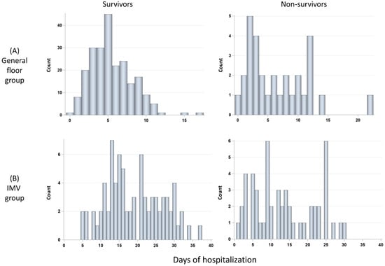 The durations of hospitalization of the general floor group were stratified by survivors (N = 224) and non-survivors (N = 28) (Figure 5A). The number of days of hospitalization of the general floor group was not significantly different between non-survivors (median 4.5 days [IQR:2, 9.5]) and survivors (median 5 days [IQR = 3, 7], p > 0.05). The histograms of duration of hospitalization of the IMV group stratified by survivors (N = 92) and non-survivors (N = 56) (Figure 5B). The number of days of hospitalization was not significantly different between non-survivors (median 12.5 days [IQR:6.5, 22]) and survivors (median = 18.5 days [IQR = 13, 26], p > 0.05). IMV patients were in the hospital markedly longer than GF patients (p < 0.01 for both survivors and non-survivors).
