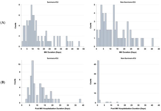 Histograms of days (A) on and (B) off invasive mechanical ventilation (IMV) for survivors (N = 85) and non-survivors (N = 58).