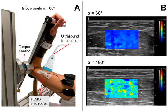(A) Experimental setup showing a patient’s left arm placed in the custom-made apparatus. The elbow joint axis is aligned with the rotational axis of the torque sensor. Surface electromyography (sEMG) electrodes are positioned at the biceps brachii (BB) and triceps brachii muscle. The ultrasound transducer is placed on top of the BB muscle belly and aligned with muscle fiber direction. (B) Exemplary ultrasound frames including shear wave propagation speed color overlays during 50% isometric ramp contractions for two elbow angles (60°, 180°) studied.