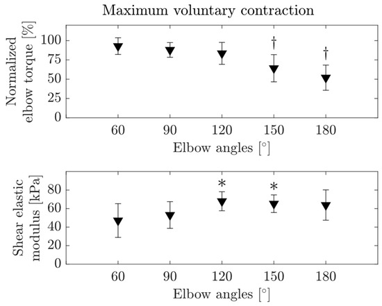 Average normalized elbow flexion torque and total shear elastic modulus of the biceps brachii muscle during maximum voluntary contractions at the five elbow angles studied (60°, 90°, 120°, 150° and 180°). Error bars visualize the standard deviation. The cross and star signs indicate that the measured value is significantly different from the normalized elbow torque at 60°, 90°, 120° and the shear elastic modulus measured at 60° elbow angle (p < 0.05), respectively.