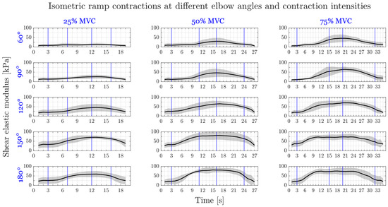 Average total shear elastic modulus of the biceps brachii muscle during elbow flexion isometric ramp contraction trials with standard deviation (in light grey shades). Columns show the three contraction intensities with a constant level up to 25%, 50% and 75% of maximum voluntary (MVC) elbow torque, rows show the five elbow angles studied (60°, 90°, 120°, 150° and 180°). Vertical blue lines indicate the different sections of the trapezoid line to be followed.
