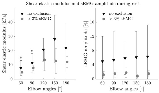 Average shear elastic modulus of the biceps brachii muscle (BB) and sEMG amplitude of the BB during rest (no exclusion, black triangles) and with the exclusion of the sEMG amplitude > 3% (grey circles). Error bars visualize the standard deviation. * Significant different to 150° elbow angle (p < 0.05).