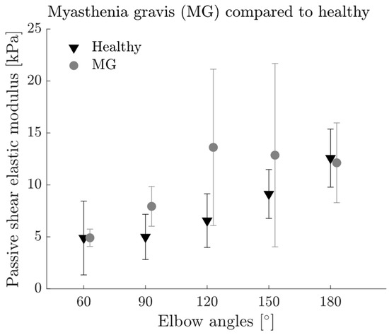 Compared to healthy participants [13], the shear elastic modulus of BB during rest was 2.1 times higher for MG patients (p < 0.001) and elbow angle had a significant effect (p < 0.001) without interaction (p > 0.05).