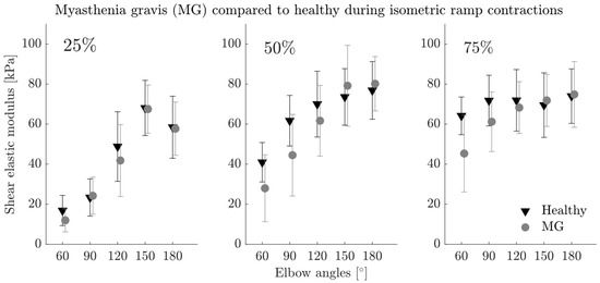 The active shear elastic modulus was significantly lower for MG patients compared to the healthy group for all contraction intensities (p < 0.001 for 25%, 50% and 75% MVC torque). It was 38.99%, 28.08% and 21.99% lower at 25%, 50% and 75% MVC torque, respectively. Elbow angle had a significant effect for 25% and 50% MVC torque (p < 0.001 for both) but not for 75% (p = 0.217).