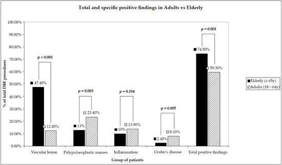 The overall diagnostic yield of DBE was significantly different between the two groups (p = 0.001, Figure 2): 59.3% in the younger group and 74.5% in the older group. The detection rates for Crohn’s disease and for polyps or other small bowel masses were significantly higher in the younger group (p = 0.005 and p = 0.003, respectively). Instead, vascular lesions were more frequently detected in the older group (p < 0.001). Although the detection of aspecific inflammation was more frequent in the younger group (13.9% vs. 10%), there was no statistically significant difference between the two groups (p = 0.194). Biopsies and tattooing were more often performed in the younger group (p < 0.001 and p = 0.034, respectively).