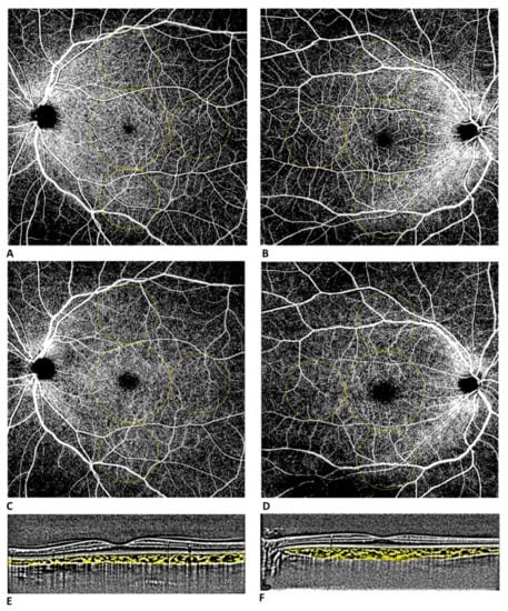 For each eye, 12 × 12 mm volume scans centered on the fovea were performed. All vascular retinal layers were identified and segmented in the SCP and DCP [23]. The projection-resolved algorithm was used to eliminate projection artifacts. This algorithm retains flow signals from blood vessels and suppresses projected flow signals in deeper layers [24].