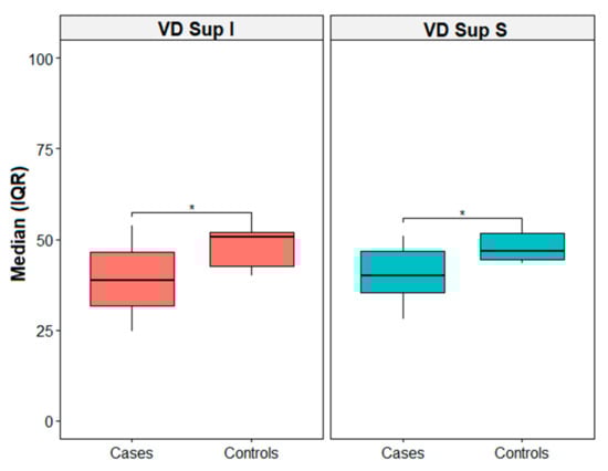 Box plot for VD Sup I and VD Sup S. * = p-value < 0.05. IQR = interquartile range.