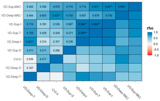 Table 2 shows descriptive statistics reported as the median, first (q1), and third (q3) quartile for the cases and controls. Indeed, differences between the groups for the visual parameters were evaluated with the Mann–Whitney U test. Thus, there was a statistically median difference between the cases and controls for VD-SCP-S (46.7 [44.4; 51.8] vs. 40.1 [35.4; 46.7], p = 0.039) and VD-SCP-I (50.6 [42.6; 52.1] vs. 38.7 [31.7; 46.6], p = 0.026) (Figure 2). Figure 3 shows the correlation matrix using the Spearman rho correlation coefficient for the cases. The data revealed a strong statistically significant positive correlation between VD-SCP-MAC and VD-DCP-MAC (rho = 0.893), and it is important to highlight that there exists a strong positive statistically significant correlation between CVI and VD-DCP-MAC (rho = 0.821).