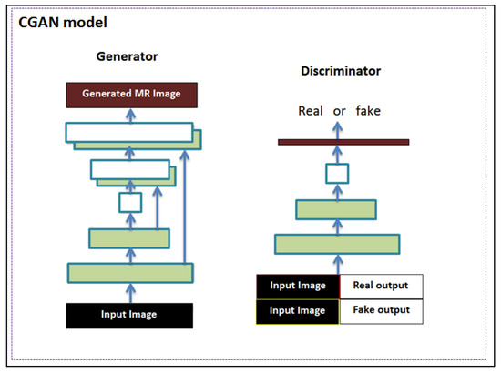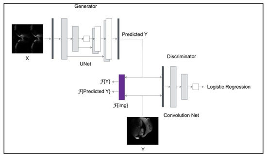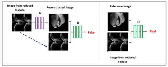 The GAN is another neural network architecture well-suited for image processing and analysis, particularly for image synthesis and reconstruction. GANs consist of two competing networks: the first, the generator, is the network that transforms the random noise to generate ‘fake’ but realistic-looking images. The second network, called the discriminator, is a different network, trained to classify whether the images generated by the generator are real or ‘fake’. Here, we implemented the GAN with the U-Net architecture as a generator and a convolutional network as a discriminator. The discriminator network comprised six consecutive convolutional layers, four out six followed by batch normalization and all followed by an activation function (ReLU in the first five and sigmoid in the last layer). Another adopted modification to the classic GAN architecture fed the generator not with random noise, but with an MR image obtained from the reduced k-space [18]. This modification allowed such a model to be called image-conditional GAN (CGAN), as shown in Figure 3.