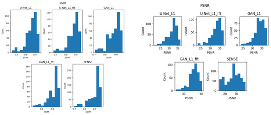 After the PSNR and SSIM metrics were calculated using the test dataset for every architecture, the metrics distributions were tested for statistically significant differences. The choice of the statistical significance test depends critically on the type of the data distribution. As a rule, if the samples have a normal distribution, then a t-test is used. If the data distribution does not meet the requirements for normality, then other approaches are undertaken, the most commonly known being the Mann–Whitney U-test. It is therefore necessary to first conduct a test for data normality and then evaluate the statistical significance. Normality tests were carried out using a qualitative histogram evaluation as well as a Shapiro–Wilk normality test. The essence of normality verification is to put forward the null hypotheses that the data are distributed normally with the error probability of 0.05. Thus, H0 is “the data come from the normal distributions (accepted if p > 0.05)”; otherwise, H1 (rejected), meaning that data do not come from the normal distribution. The results of the Shapiro–Wilk normality test are presented in Table 3.