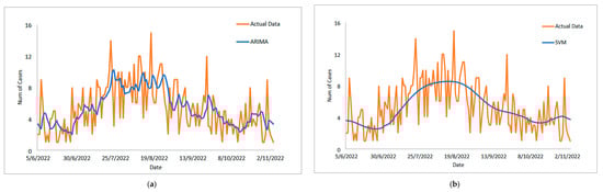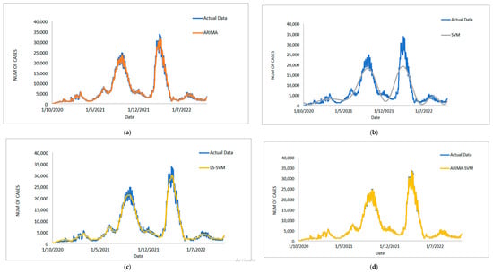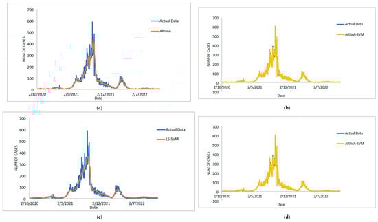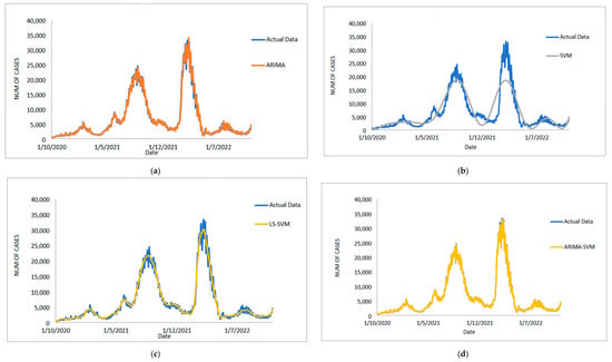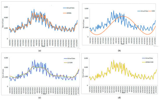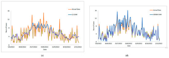 Results obtained from the proposed model for daily new positive COVID-19 cases dataset: (a) actual data vs. ARIMA model, (b) actual data vs. LSSVM models, (c) actual data vs. SVM model, (d) actual data vs. ARIMA–SVM models, (e) actual data vs. ARIMA–LSSVM models.