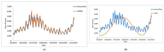 This study’s innovative and evidence-based methods make a valuable contribution to pandemic prediction and prevention, providing significant insights that can be used to mitigate the impact of future outbreaks. The implications of this research extend to public health authorities, policymakers, and researchers worldwide, offering powerful tools for mitigating the devastating effects of pandemics. The remainder of this paper is structured as follows. Materials and Methods goes into detail about the method we used to develop our proposed model. The hybrid ARIMA–SVM model used in this study is then briefly described. The results and discussion present the performance of our proposed model based on three known COVID-19 case datasets. Finally, we wrap up the article and make suggestions for future research.