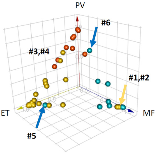 3D plot of the predicted likelihood of Kimura et al.’s automated diagnostic support system with deep learning algorithms for the distinction of myeloproliferative neoplasms. Six misclassified cases are labeled #1–#6.