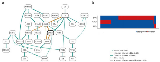 Bayesian networks (BNs) are artificial intelligence (AI) models that can define complex joint probability regions. Angelopoulos et al. [32] used the BN model to analyze genetic data from 2035 individuals with myeloproliferative neoplasms and discovered a number of genomic groupings in myeloproliferative neoplasms (Figure 3). For example, mutations in TP53 co-occurred with chromosomes 17p and 5q29 deletions. Another grouping, characterized by LOH at chromosome 4q, abnormalities in chromosomes 7 and 7q occurring in conjunction with mutations in at least 14 myeloid malignancies, accounting for the largest co-mutation pattern in the Bayesian network, was enriched for patients with PMF. Moreover, JAK2 was identified as the most mutated gene in the network, with CALR and MPL mutations exhibiting reciprocal exclusivity patterns, demonstrating functional redundancy in their pathogenic processes. The three genes (JAK2, CARL, and MPL) accounted for most of the dataset’s total driver mutations. The BN model beautifully depicts the major players’ three-way mutual exclusivity. Moreover, the genomic landscapes elucidated by the BNs are supported by clinical exome sequencing studies assessing driver mutations in MPNs [46,47]. Understanding the genomic landscape of MPNs using AI may prove useful in developing diagnostic panels that complement and confirm clinical diagnoses.