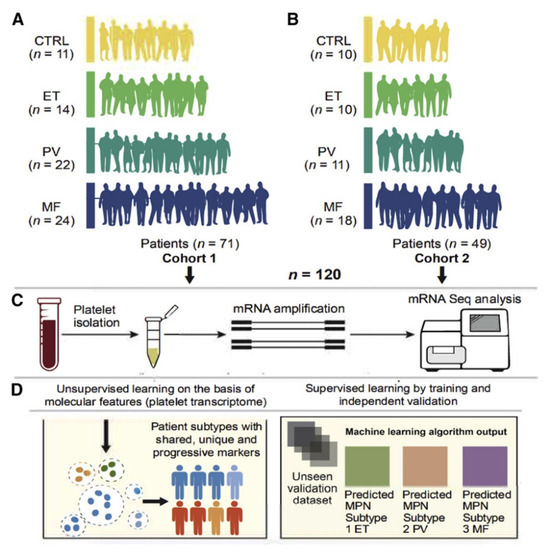 Graphical abstract of Shen et al.’s machine learning algorithm for myelofibrosis prediction using platelet transcriptome of myeloproliferative neoplasms. (A,B) Two independent cohorts of MPN patients and healthy controls were included. (C) Platelets from peripheral blood samples of the two cohorts were isolated and sequenced to yield a platelet transcriptome. (D) Machine learning approaches, including unsupervised and supervised techniques, were utilized for myelofibrosis prediction using the platelet transcriptome.