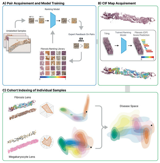 Ryou et al.’s computational steps for detection, quantitation, and visualization of reticulin fibrosis in BMTs. (A) Image tiles are labeled with fibrosis grade and used to train a ranking-CNN model that was refined using a human-in-the-loop approach. (B) The finalized model generates CIF maps by predicting scores and overlaying them on reticulin-stained images. (C) Fibrosis features are represented in a two-dimensional disease space, enabling comparison of MPN subtypes and individual patient BMTs against a sample library.