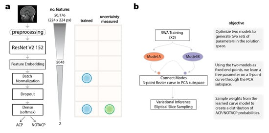 We applied the subspace inference method in [42] to construct a calibrated induced posterior of our deep learning model, as illustrated in Figure 1b. This process consists of three steps. First, we constructed a low-dimensional subspace of the parameter space using the first principal components of the optimizer trajectory on the loss surface. Next, we used a geometric curve to connect two high performing models in the constructed subspace. Lastly, we applied elliptical slice sampling to sample from the geometric curve, yielding predictive distributions of the suprasellar tumor diagnosis. To implement this approach, we utilized TensorFlow (available at https://github.com/lericnet/bsi-acp-mri (accessed on 30 January 2023) to support our existing model. The approach is described in further detail in the following subsections.