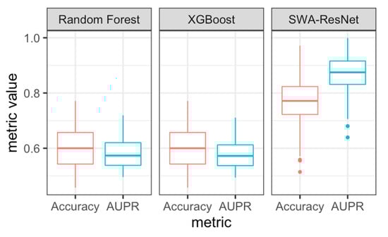 Comparison of accuracy (as a decimal, red boxplot) and area under the precision-recall curve (AUPR, blue boxplot) of classifiers on ResNet feature embeddings of ACP MRI.