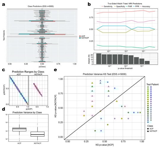 Although Figure 4a shows that the means do not appear significantly different, there are some patterns with respect to variance across the two classes; the boxplots in the ACP cohort (Figure 4a, top half) typically have wider ranges (Figure 4c,d) than those in the NOTACP cohort (Figure 4a, bottom half). This indicates that the model is more generally uncertain about predicting ACP patients than NOTACP patients. We sought to leverage this observation and calculated the statistical significance of a given patient belonging to a ground truth group based on their predictive variance using a Kolmogorov-Smirnov (KS) test. Plotting the -values for each class (Figure 4e), we observed that the ACP and NOTACP classes (circles and triangles, respectively) could be separated by the ratio of -values (Figure 4e, diagonal line). Therefore, the variance of the predictive distributions is informative in our classification task.