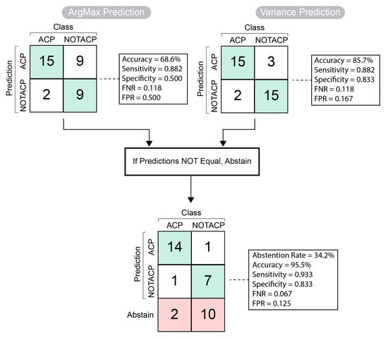 The sensitivity and FNR was unchanged between the two prediction methods. We then compared the predictions from each method and observed a high accuracy if both methods predict the same value. Specifically, we observed an accuracy of 95.5%, sensitivity of 0.933, specificity of 0.833, FNR of 0.067, and FPR of 0.125. This was in the context of abstaining from prediction in 34.2% () of cases. Out of the abstained cases, 10/12 (83.3%) were from the NOTACP group; 2/12 (16.6%) were from the ACP group.