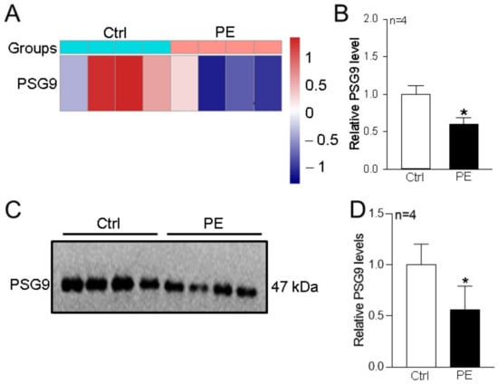 Changes in serum PSG9 levels in patients with preeclampsia. (A,B) Cluster thermographic analysis (A) and summary data (B) showing serum relative PSG9 expression levels identified by isobaric tags for relative and absolute quantitation combined with LC-MS/MS technology in healthy control (Ctrl) pregnant women and patients with preeclampsia (PE). Red indicates an increase in expression level, whereas blue indicates a decrease. The darker the color, the greater the change. (C,D) Representative Western blot image (C) and summary data (D) showing serum PSG9 expression levels in healthy control pregnant women and patients with preeclampsia. In (B) and (D), the mean PSG9 level for healthy control pregnant women served as the denominator, and all data were divided by this mean. Values are shown as the mean ± SEM (n = 4 per group). * p < 0.05 for PE vs. Ctrl.