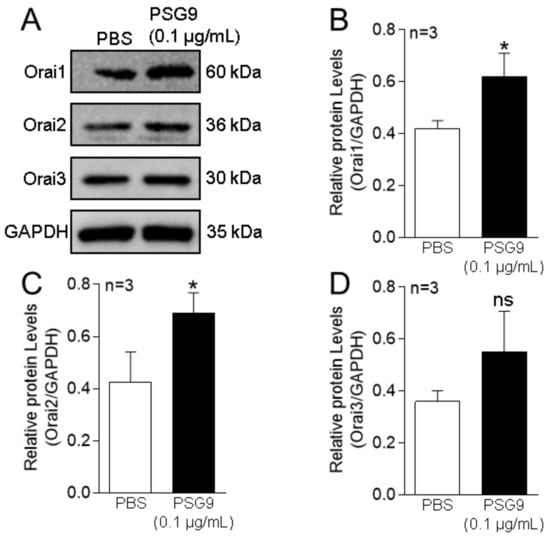 Effect of PSG9 on Orais expression in human umbilical vein endothelial cells (HUVECs). (A–D) Representative Western blot images (A) and summary data (B–D) showing Orai1, Orai2, and Orai3 expression levels after application of phosphate-buffered saline (PBS) or 0.1 μg/mL PSG9 for 24 h in HUVECs. Values are shown as the mean ± SEM (n = 3 as indicated). * p < 0.05 compared with PBS; ns, no significant difference.