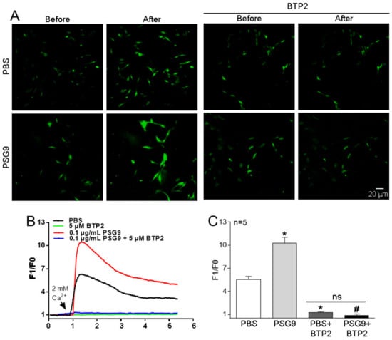 Many studies have shown that eNOS production and NO release are closely related to intracellular Ca2+ homeostasis [,]. SOCE controlled by the intracellular Ca2+ pool is an important pathway mediating extracellular Ca2+ influx and participates in a myriad of physiological and biochemical processes of various cells. The Orai family proteins make up the Ca2+ channel in the SOCE system. To investigate the effect of PSG9 on SOCE in HUVECs, we treated the cells with 0.1 μg/mL PSG9 for 24 h. Our Western blotting data showed that the application of PSG9 significantly enhanced the expression levels of Orai1 and Orai2, but not of Orai3 (Figure 2A–D). Our functional assay results indicated that PSG9 treatment also markedly increased the SOCE evoked by TG-induced Ca2+ store depletion in HUVECs and that this increased SOCE was nearly completely abolished by pretreatment with the Orai inhibitor BTP2 (0.5 μM) (Figure 3). These findings indicated that PSG9 increased SOCE by stimulating increased expression levels of Orai1 and Orai2 in HUVECs.