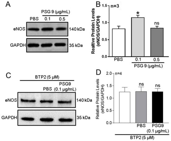 Effect of PSG9 on endothelial nitric oxide synthase (eNOS) expression level in human umbilical vein endothelial cells (HUVECs). (A–D) Representative Western blot images (A,C) and summary data (B,D) showing the expression of eNOS in HUVECs incubated with PBS or different concentrations (0.1 or 0.5 µg/mL) of PSG9 for 24 h (A,B), or with BTP2 (5 μM) + PBS or BTP2 (5 μM) + PSG9 (0.1 μg/mL) (C,D). Values are shown as the mean ± SEM. * p < 0.05 compared with PBS; ns, no significant difference.