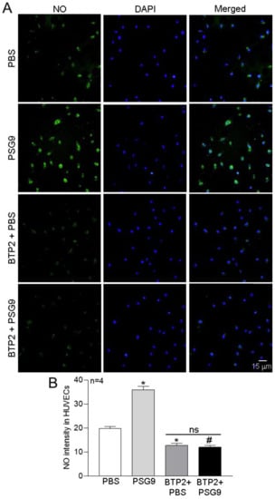 Effect of PSG9 on nitric oxide (NO) production in human umbilical vein endothelial cells (HUVECs). (A,B) Representative fluorescence images (A) and summary data (B) showing NO levels (green fluorescence) in HUVECs treated with PBS, BTP2 (5 μM) + PBS, 0.1 μg/mL PSG9, and 0.1 μg/mL PSG9 + BTP2 (5 μM). The nucleus is indicated by blue fluorescence (4′,6-diamidino-2-phenylindole; DAPI). Values are shown as the mean ± SEM of fluorescence arbitrary units (n = 4 in each group). * p < 0.05 compared with PBS, # p < 0.05 compared with PSG9; ns, no significant difference.