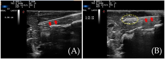 (A) An ablation needle was inserted during RFA. The tip of the ablation needle is about one centimeter from the liver surface. The red arrows indicate the ablation needle rod. (B) The yellow dotted circle indicates the vaporization zone during the ablation.