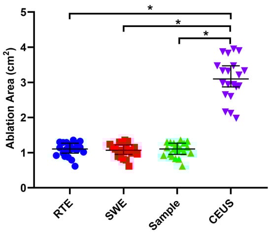 The ablation area was measured by different measurement methods. There was no statistical difference in the area of the ablation lesions measured by RTE, SWE, and gross specimen. The area of ablation lesions measured by CEUS is larger than the first three, and their differences are statistically significant. Results are represented as the means ± SD. Blue dots mean RTE group, red dots mean SWE group, green dots mean Sample group, purple dots mean CEUS group, * p < 0.05.