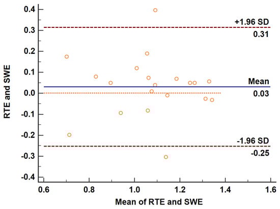 Bland–Altman map of the differences between RTE and SWE for the ablation zone after treatment. The Bland–Altman test was used to measure the ablation area after treatment. The mean of the difference between the paired data of twenty cases was 0.03 cm2, the 95% agreement margin was −0.03 to 0.09, and 10% (2/20) points are outside the 95% consistency limit. RTE, real-time elastography; SWE, shear wave elastography.